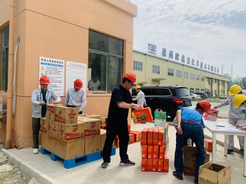 董事長張中標、總經(jīng)理李新東為員工分發(fā)端午禮品 員工們井然有序的領(lǐng)取禮品