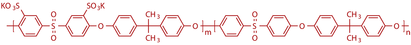 磺化單體與4,4‘-二氯二苯砜、雙酚A直接無分水條件下聚合,分子量、磺化度即離子交換容量以及磺酸基團位置得到精確控制,重復(fù)性得以保障,聚合快速,生產(chǎn)周期短、能耗低,實現(xiàn)低碳排放生產(chǎn)。